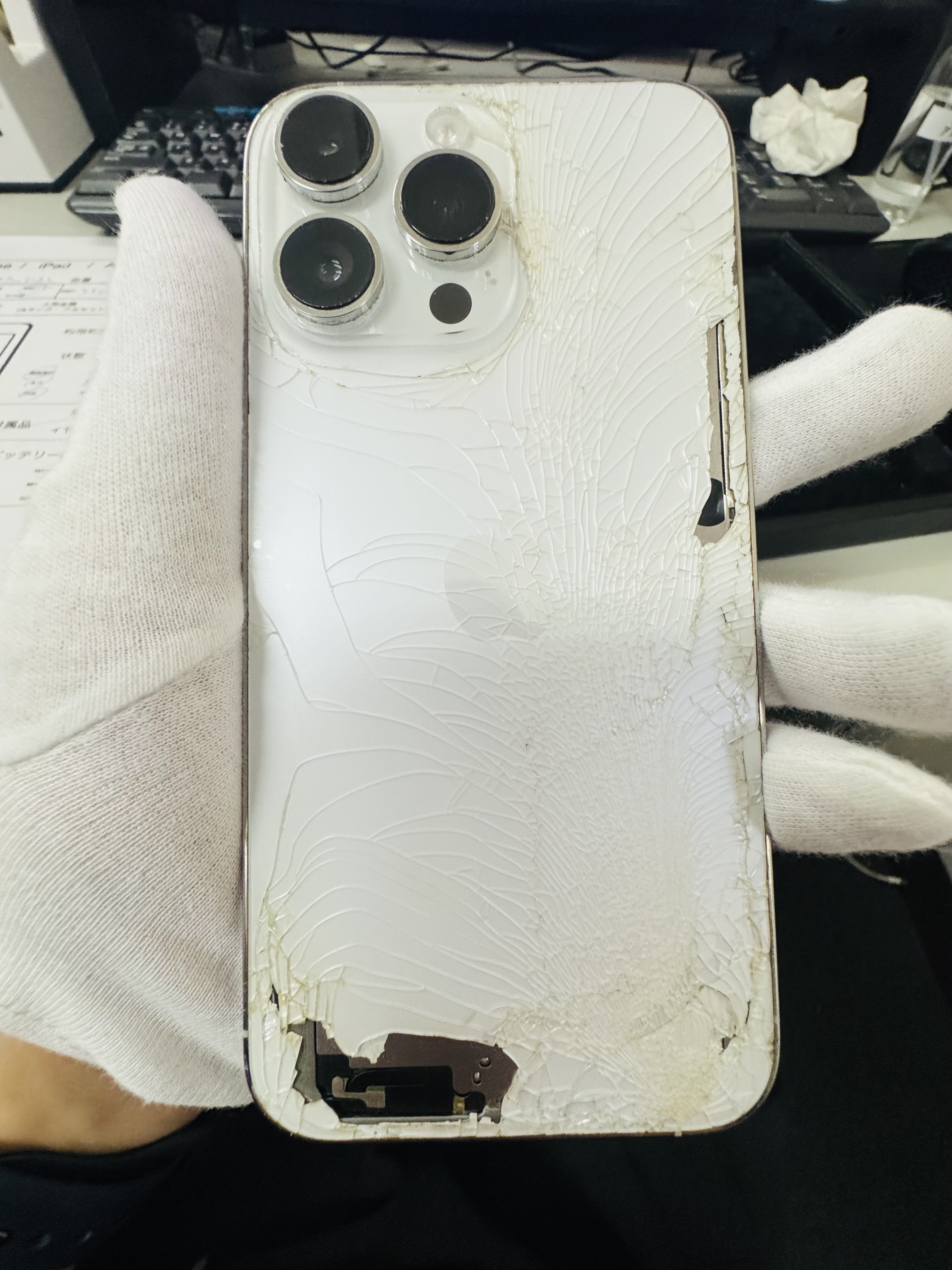 ご来店いただき誠にありがとうございます。今回お持ち込みいただいた端末は、背面割れがあり、バッテリー最大容量が74%まで低下している故障品の状態でした。